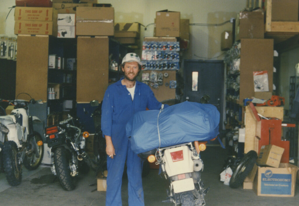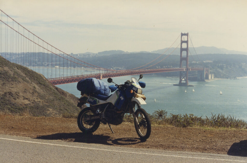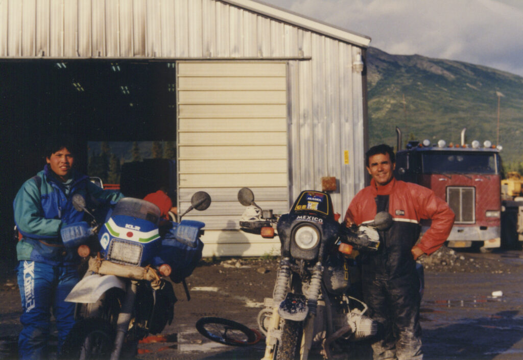 彼のバイクは、僕の中古のKLRとは違って、当時最新のR100GS。